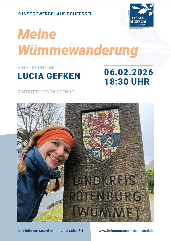 Am 6. Februar 2026 veranstaltet das Heimatmuseum Scheeßel eine Autorinnenlesung. Lucia Gefken liest aus ihrem Buch „Meine Wümmewanderung, ...